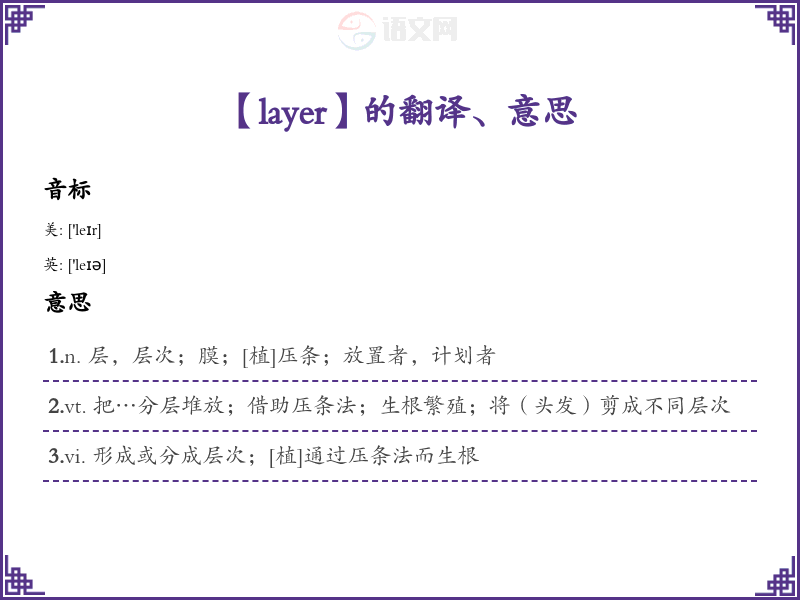 定义:Layer 是一个名词,表示物体的一个单独的、通常平坦的部分,或是将某物覆盖在另一个物体上的过程。