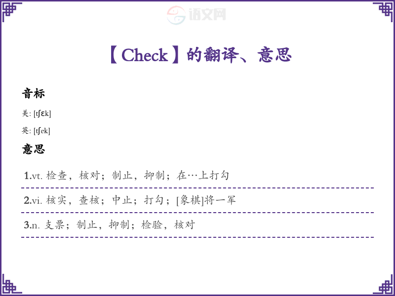 词源分析:Check源自古法语“eschequier”(意为“棋盘”)和拉丁语“scaccarium”(意为“棋盘游戏”),最初与游戏有关,后引申为“检查”。