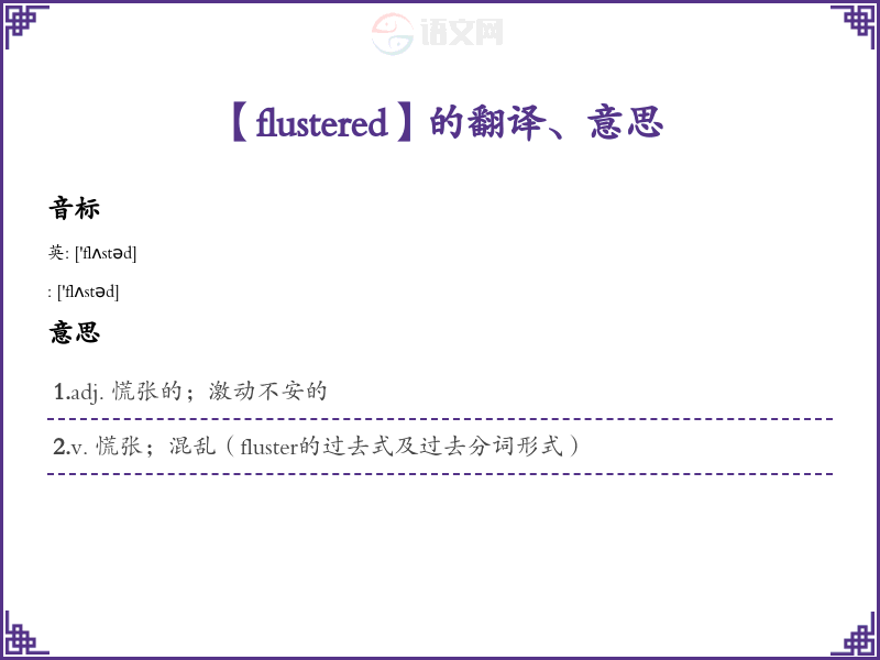 - 字面意思:Flustered 这个词的字面意思是感到困惑、不安或烦乱。定义为“因紧张、焦虑或混乱而感到不知所措”。