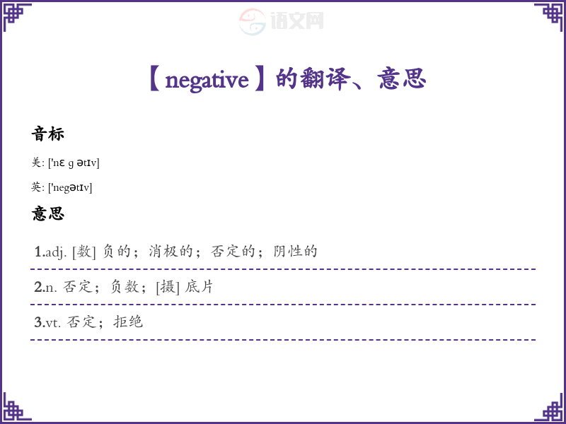 - 音标记忆法:通过学*发音 /ˈnɛɡətɪv/,可以帮助记住单词的发音和拼写。