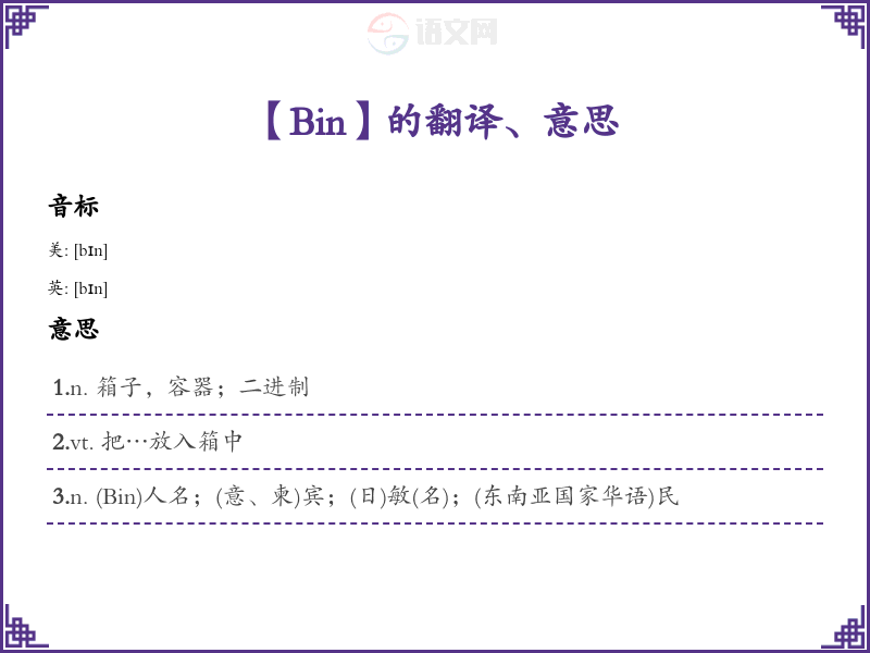 - 词根记忆法:记住“bin”作为“容器”的概念,联想到其他与存放或分类有关的词汇,如“container”(容器)、“basket”(篮子)等,从而加深理解。